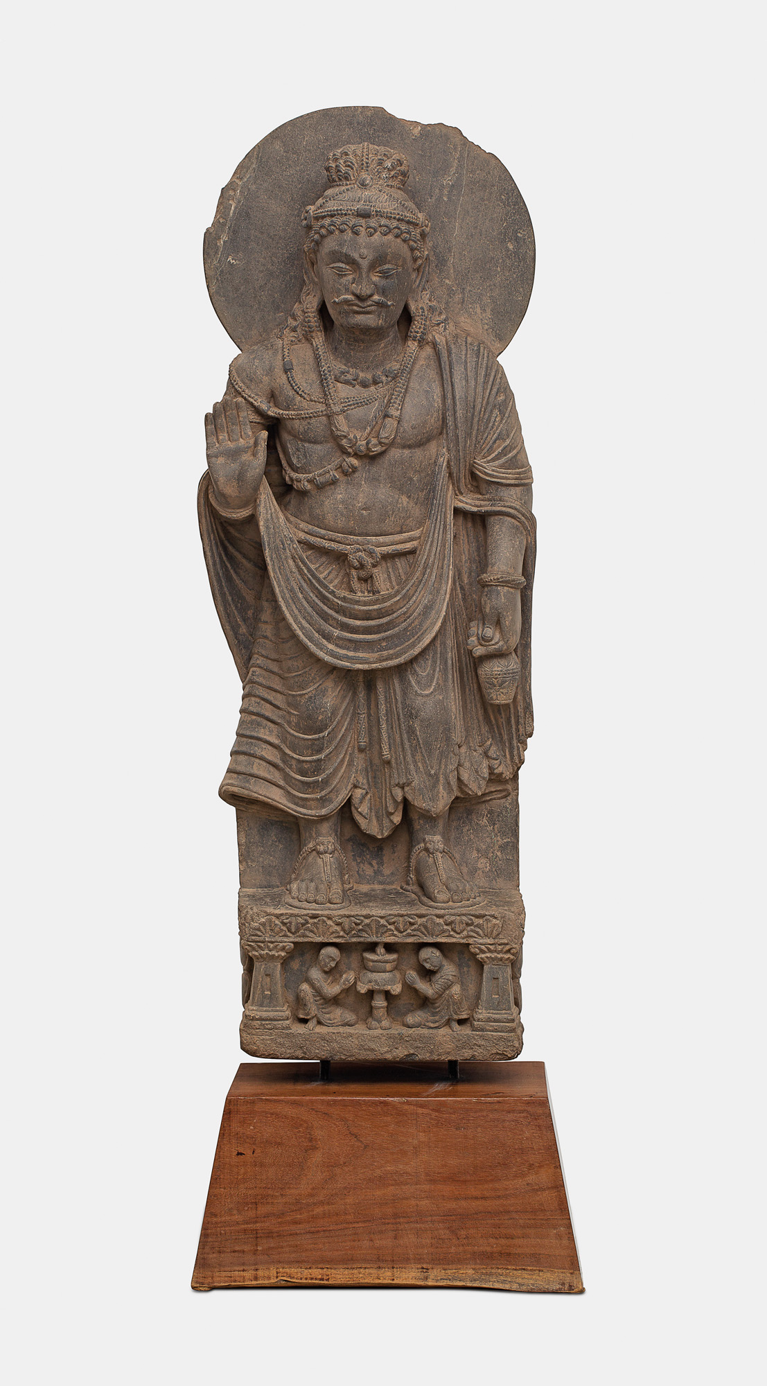 Olhe também com atenção para os detalhes que estão aos pés da escultura. Perceba as pequenas colunas, que lembram colunas greco-romanas. As esculturas da região de Gandhara (hoje parte do Paquistão) incorporam elementos estilísticos da Grécia e Roma antigas. Você também pode ver a influência ocidental na vestimenta, que se assemelha a uma toga, e nas sandálias.