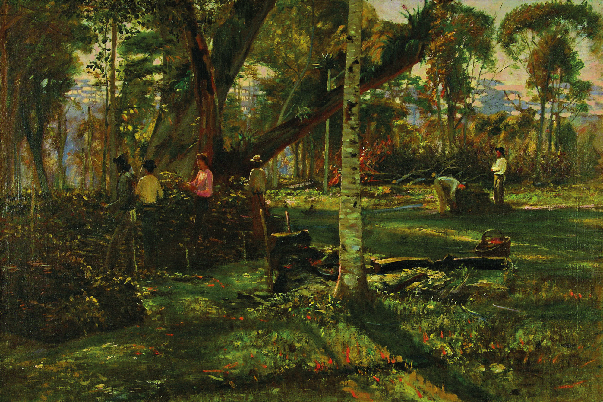 Esta pintura retrata uma paisagem. Algo interessante para refletir sobre ela é o fato de que o artista norueguês Alfredo Andersen interessava-se por retratar a realidade. Um exemplo é esta obra, que mostra o tratamento dado às folhas de erva-mate após a colheita. O ciclo da erva-mate foi a principal atividade econômica do Paraná no decorrer do século XIX, mesmo período em que Andersen residiu em Curitiba. Sabendo que esse artista não era brasileiro, o que você acha que poderia despertar mais a atenção dele nas cenas da nossa cultura?