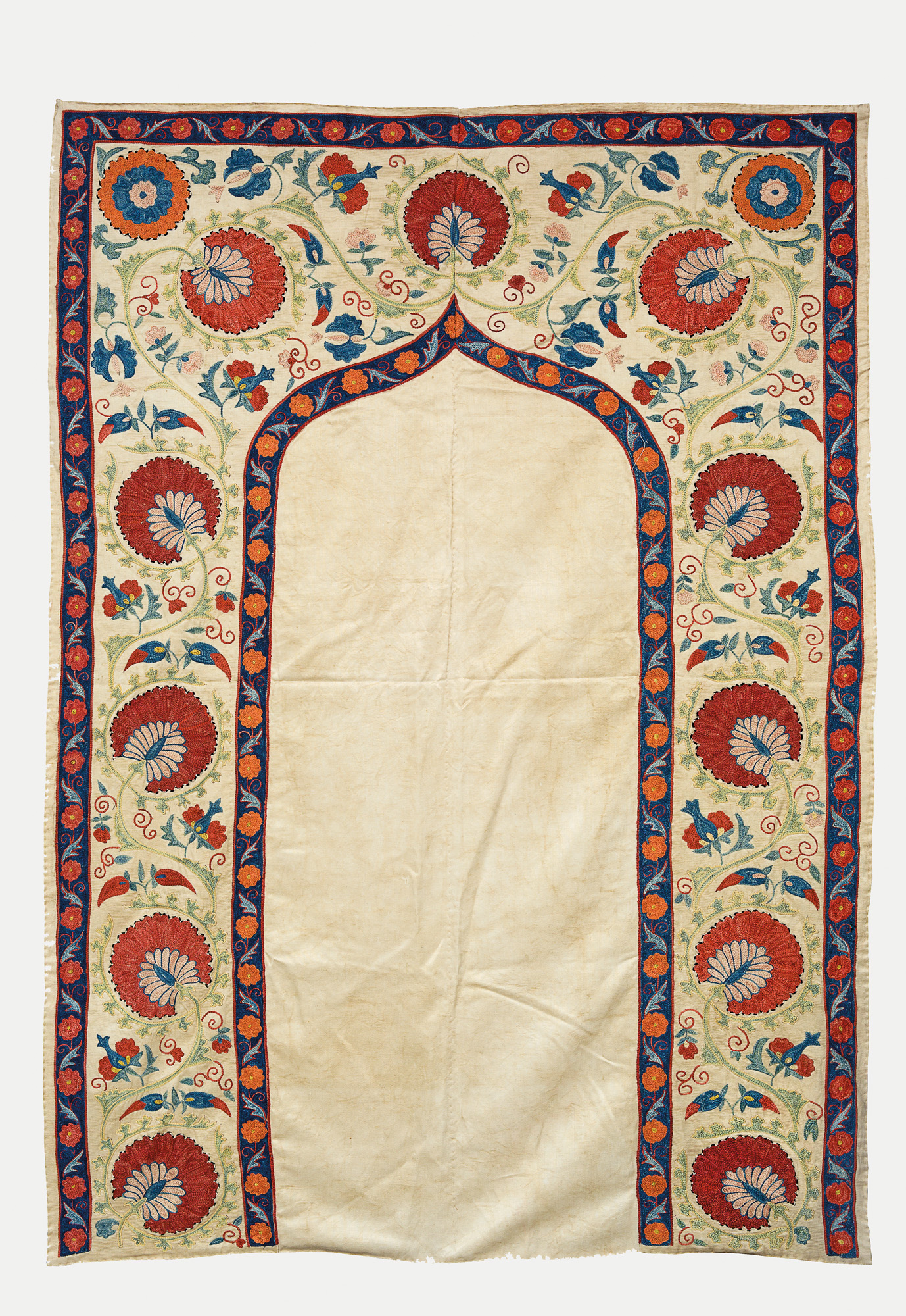 Suzani é um tipo de bordado em têxtil típico da Ásia Central. Esta peça é um tapete usado pelos muçulmanos (praticantes do islamismo) em suas cinco orações diárias, chamadas de salats. Você já viu esse ritual de oração?