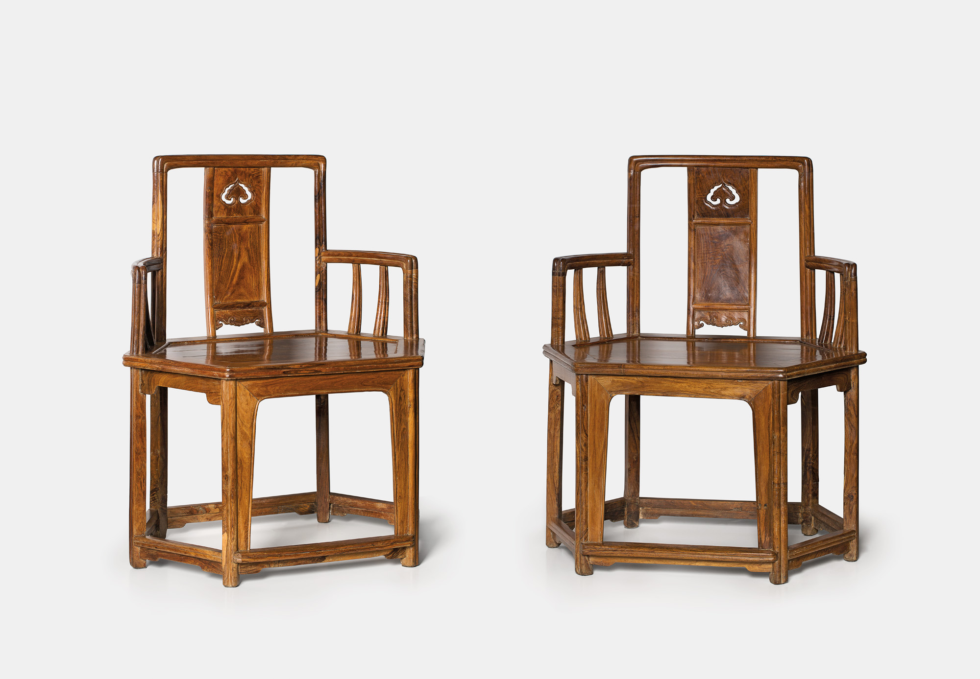 Estas peças são cadeiras de aparato, ou seja, ficavam na parte nobre das casas chinesas. Elas não eram utilizadas todos os dias, apenas em festividades ou recepção de visitas importantes. Isso explica o porquê de estarem tão bem preservadas, mesmo sendo tão antigas (dinastia Ming, 1368-1644). Você já viu uma cadeira em formato hexagonal como estas? Como o seu corpo ficaria ao sentar-se nela?
