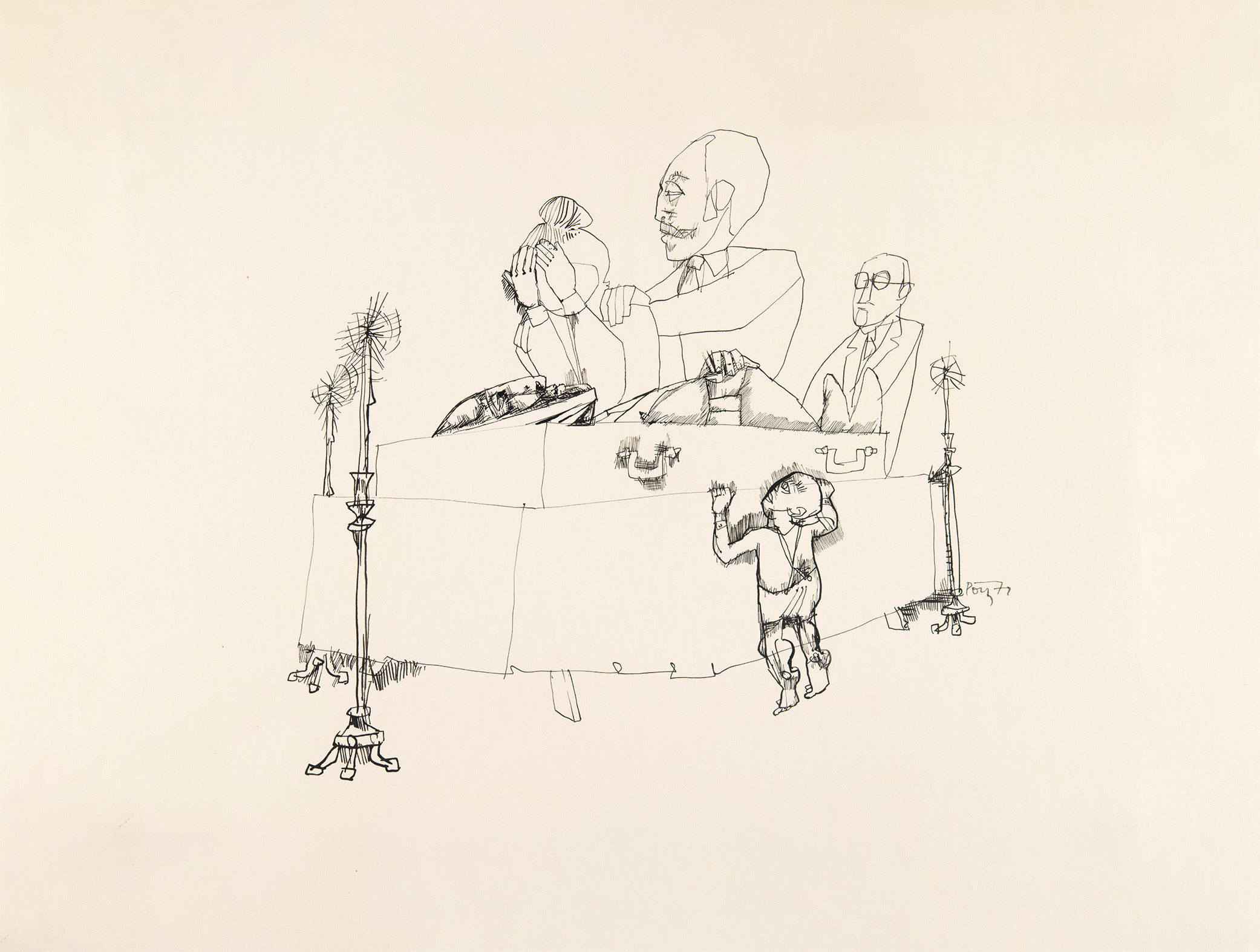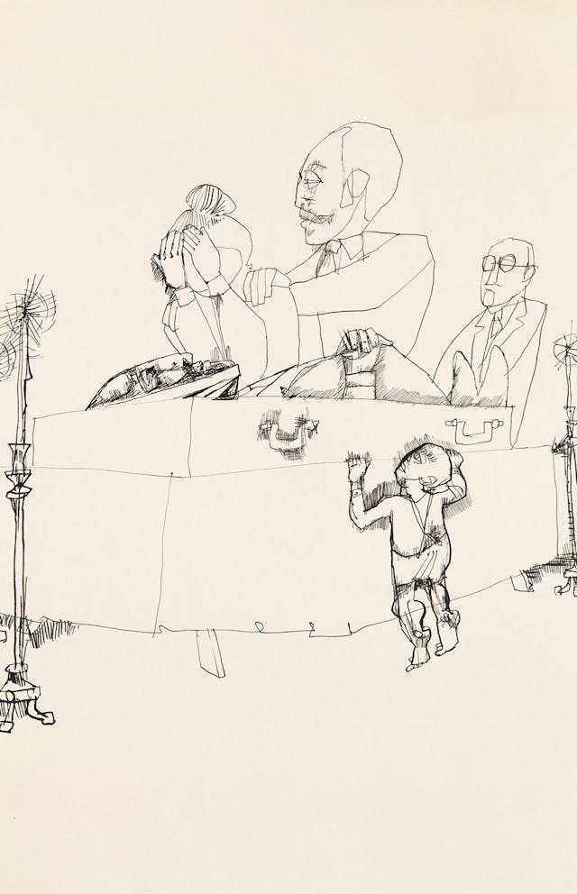 Enquanto alguns personagens são representados com poucas e finas linhas, o menino e o morto são desenhados detalhadamente. Ao observar a ação do menino, qual é sua relação com o falecido? Será que ele é capaz de enxergar? Compreender o que presencia? No desenho, qual é a relação da infância com a morte?