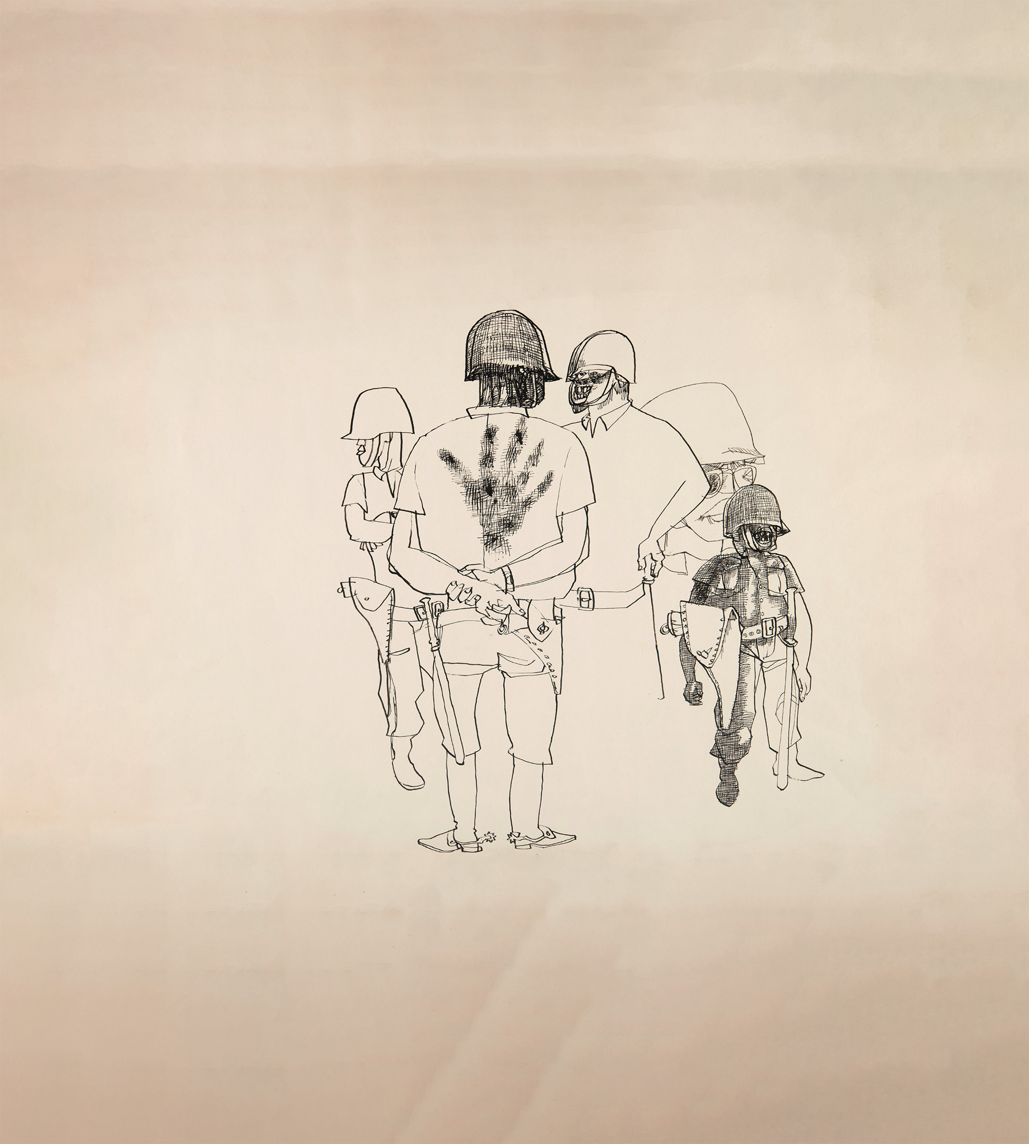 Observe o menor soldado à direita. Qual característica em seu rosto chama mais a atenção? Sua arma, assim como seu cacetete, são proporcionais à altura do seu corpo? Perceba que as sombras que incidem no corpo do personagem não incidem sobre a arma que ele carrega – como essa exceção orienta nosso olhar? Observando o conjunto desses elementos, o que o artista sugere sobre esse personagem?