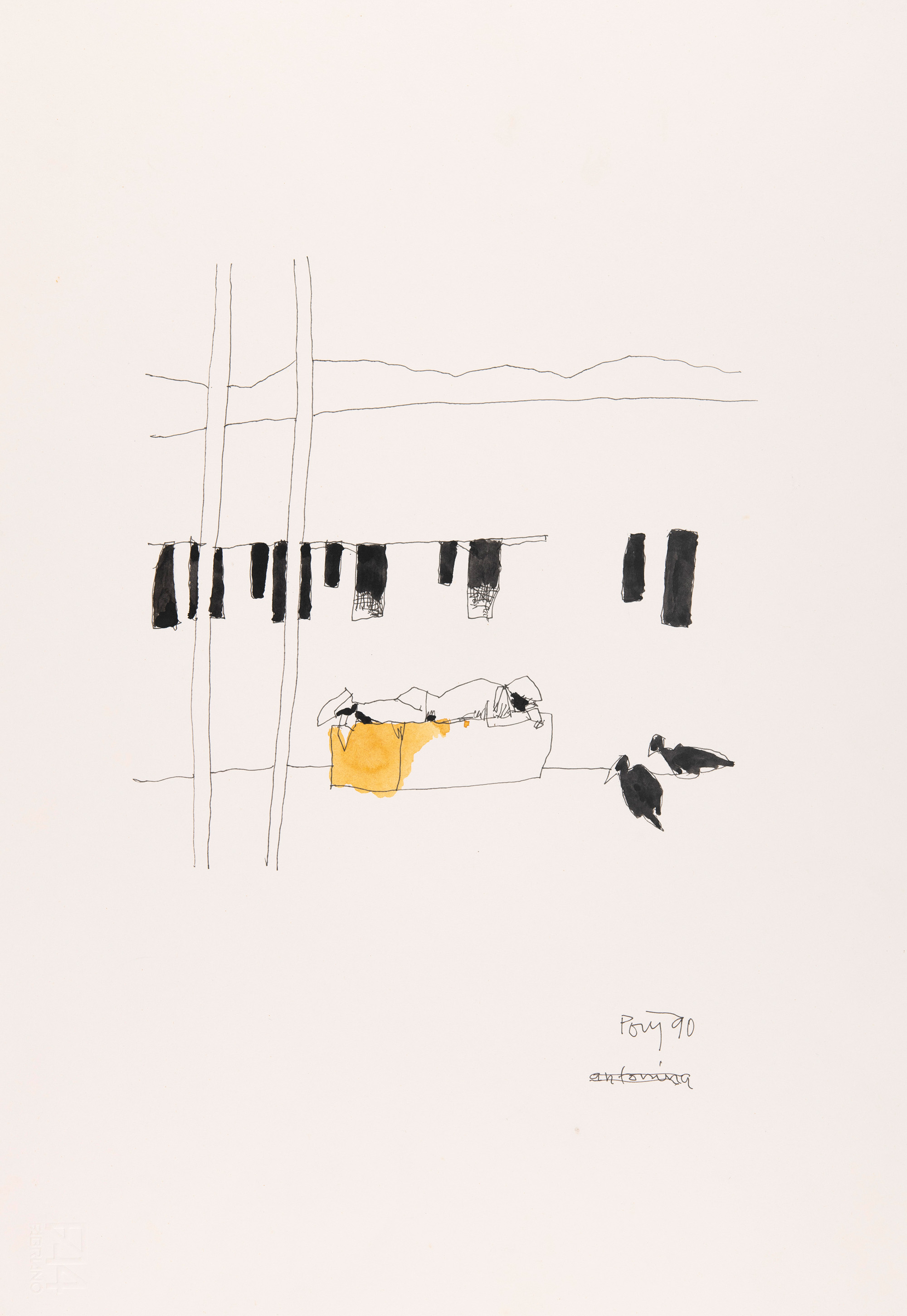 Realizado na década de 1990, o desenho que vemos é uma mistura entre as linguagens de nanquim e aquarela. Nele, como a inscrição na lateral indica, observamos o litoral paranaense, mais precisamente, a cidade de Antonina.
