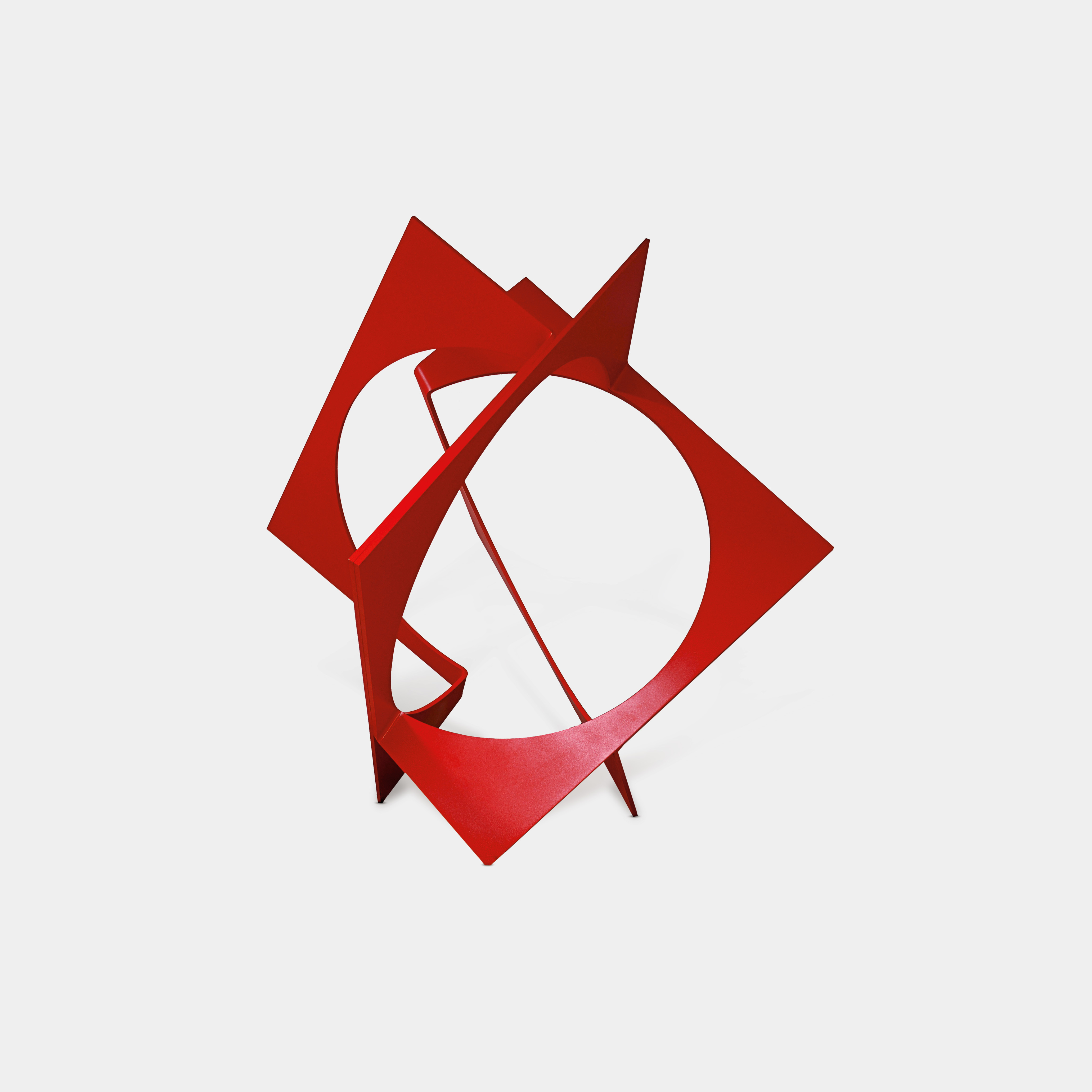 Caminhe ao redor da escultura. Perceba como ela se apoia sobre os vértices das próprias linhas, a forma que se constrói a partir da junção de três placas de metal dobradas e soldadas. Olhe para as formas circulares que os espaços vazios sugerem. Observe de perto a cor vermelha. Com cuidado, experimente o interior da obra. Qual é a forma do vazio?