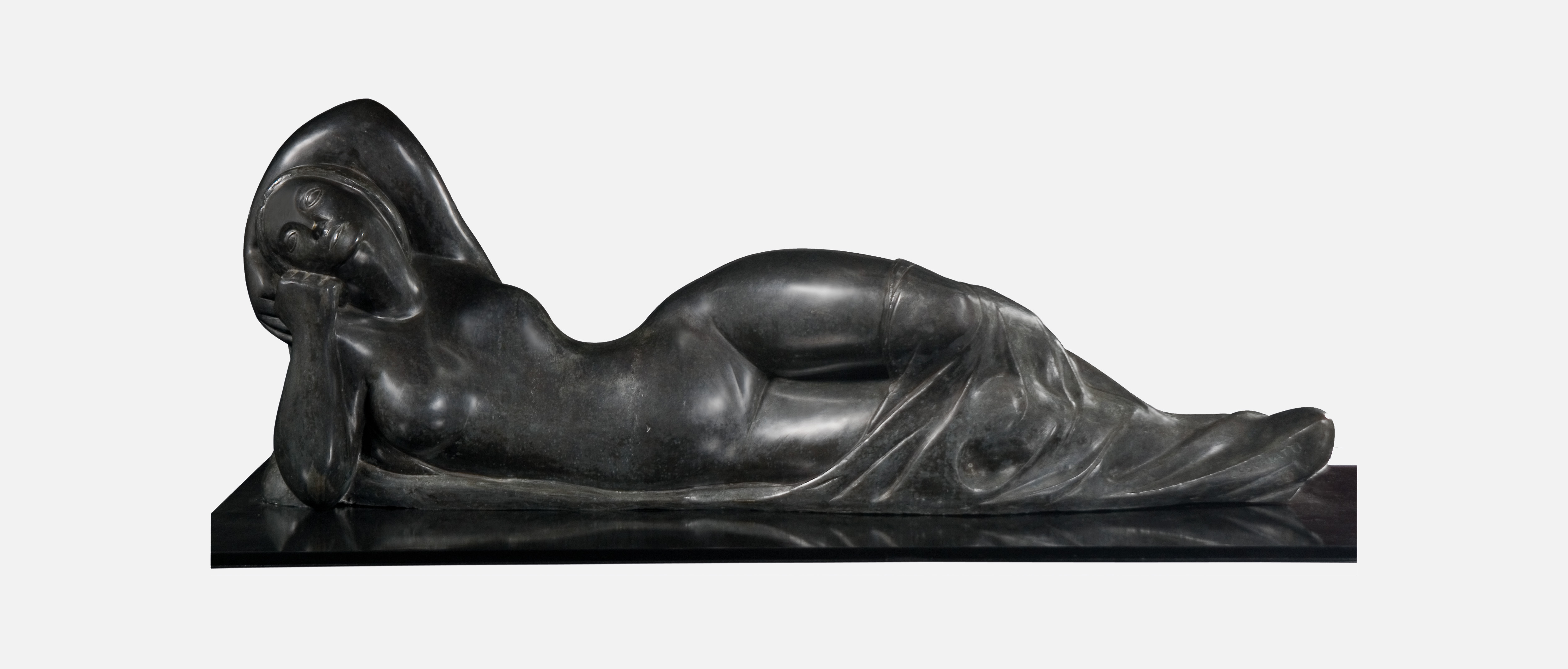 Que tal observar essa obra de longe? A escultura, que apresenta a figura de uma mulher deitada, faz você imaginar a representação sugerida pelo artista no título da obra? Você consegue enxergar outras inspirações ou referências utilizadas nessa escultura?