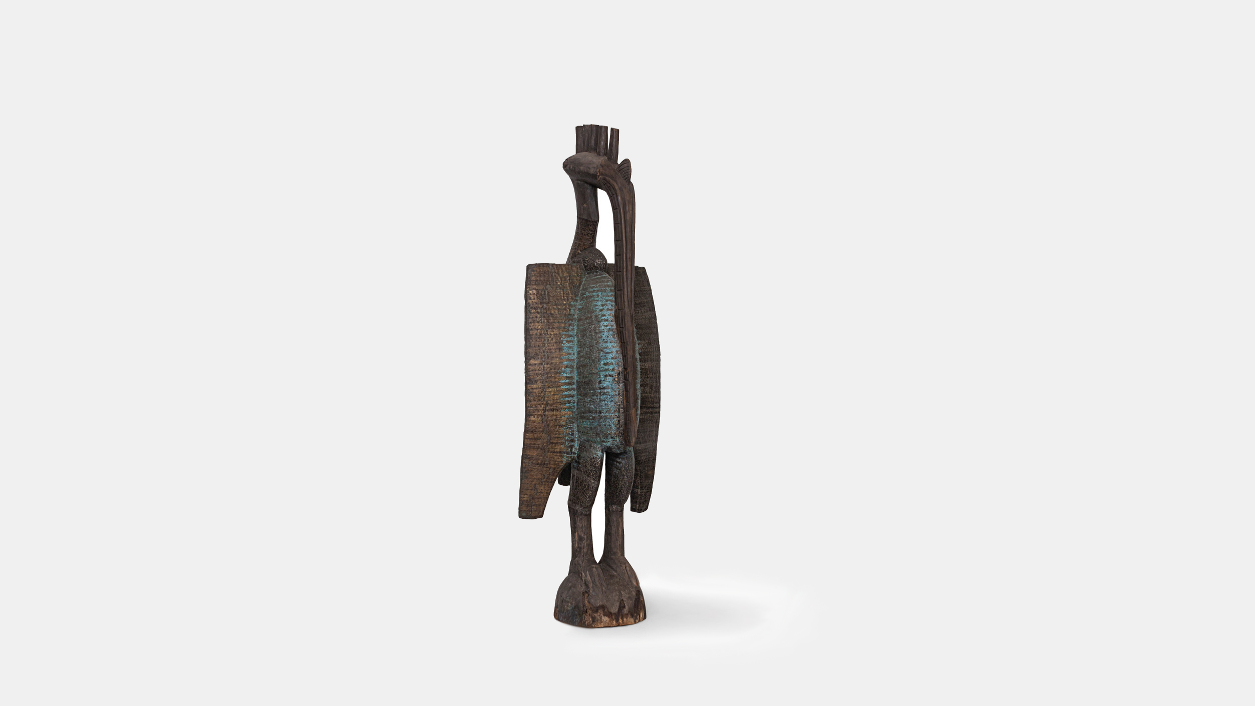 A figura de pássaro Calau mais conhecida é a Sejen, que por convenção não se aproxima tanto de uma figuração naturalista, mas sim prevalece uma forma bastante estilizada, tanto por sua altura quanto pela postura, e também pela forma das asas, cabeça e bico do pássaro. Repare nos materiais que fazem parte desta obra. Como você acredita que o escultor a fez?