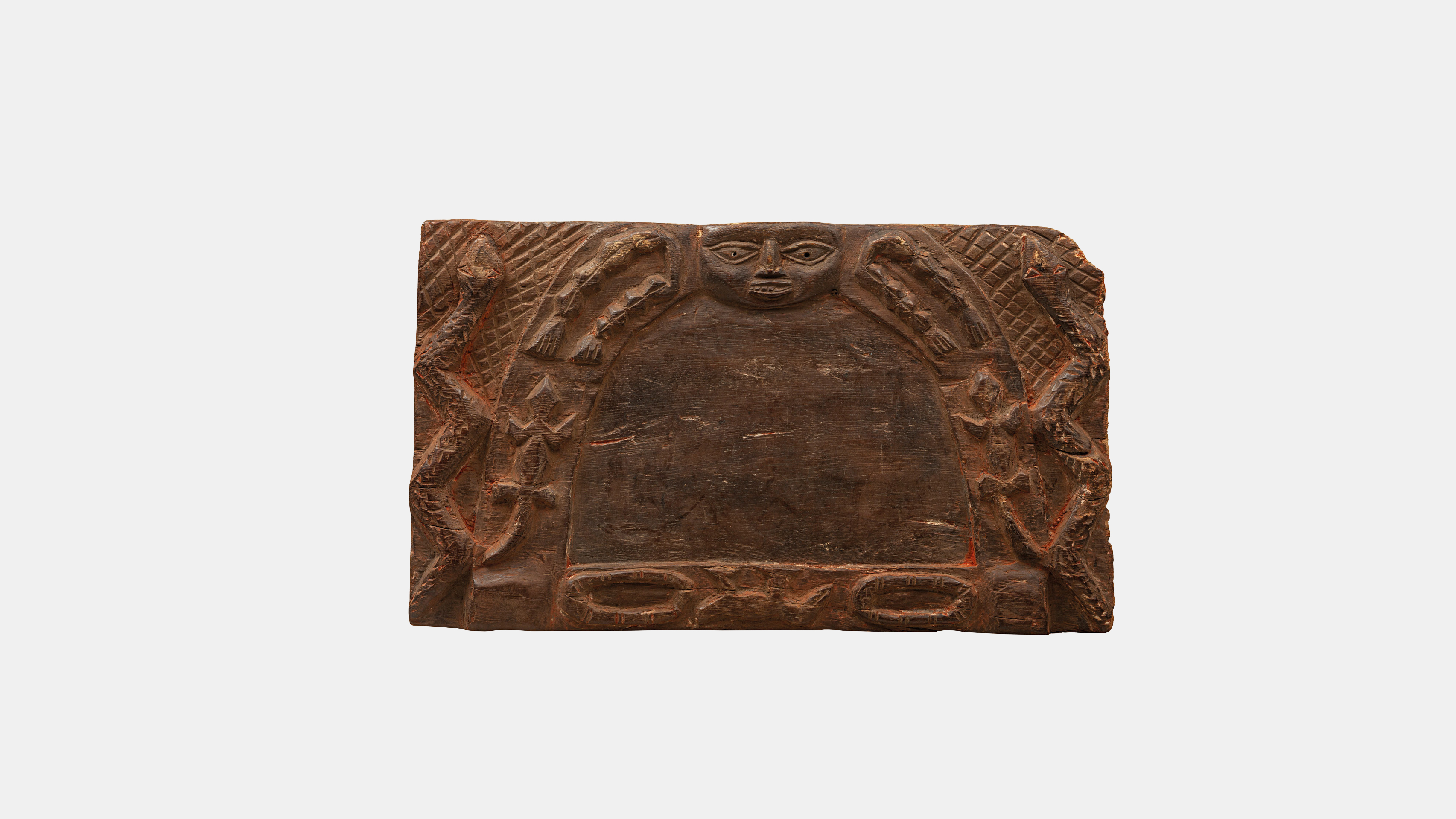 O rosto no topo da bandeja é o de Exu, enquanto o restante do aro é revestido com símbolos associados a certos “odu” (caminhos temporais do passado, presente e futuro). Uma das qualidades de Exu é ser mediador ou mensageiro entre os humanos e deuses.