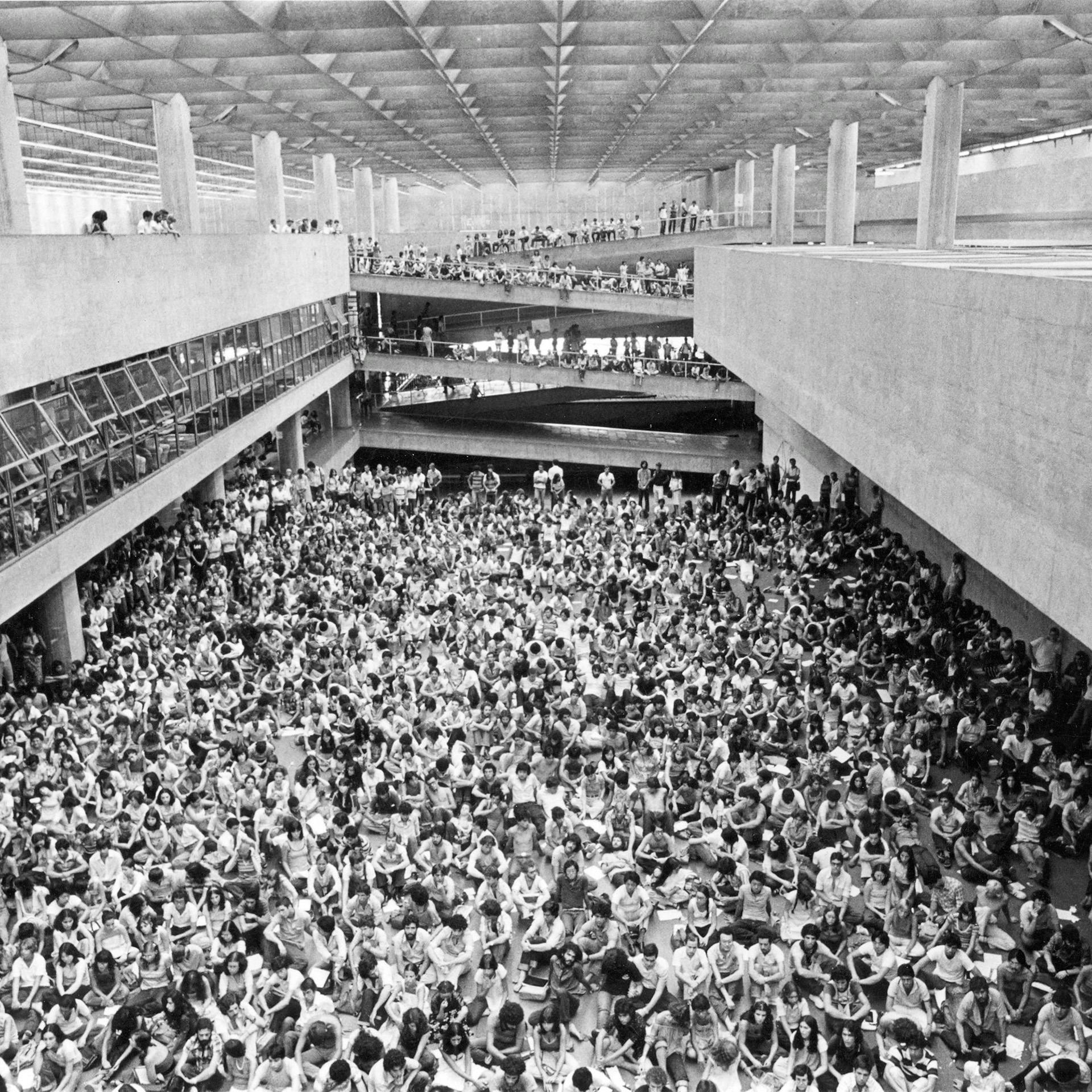 The horizontal section was designed in 1967 to house Instituto de Educação do Paraná(3); however, after construction reached completion in the 1970s, it was launched as Edifício Presidente Humberto Castelo Branco(4), it became home to Paraná state government secretariats. During the early 2000s, with architect and urban planner Jaime Lerner in the governor’s seat, the old building got re-signified, and a novel urban landmark designed by Niemeyer was added to the compound: an ample elevated exhibition room supported by a pilar that serves the purpose of a circulation tower.