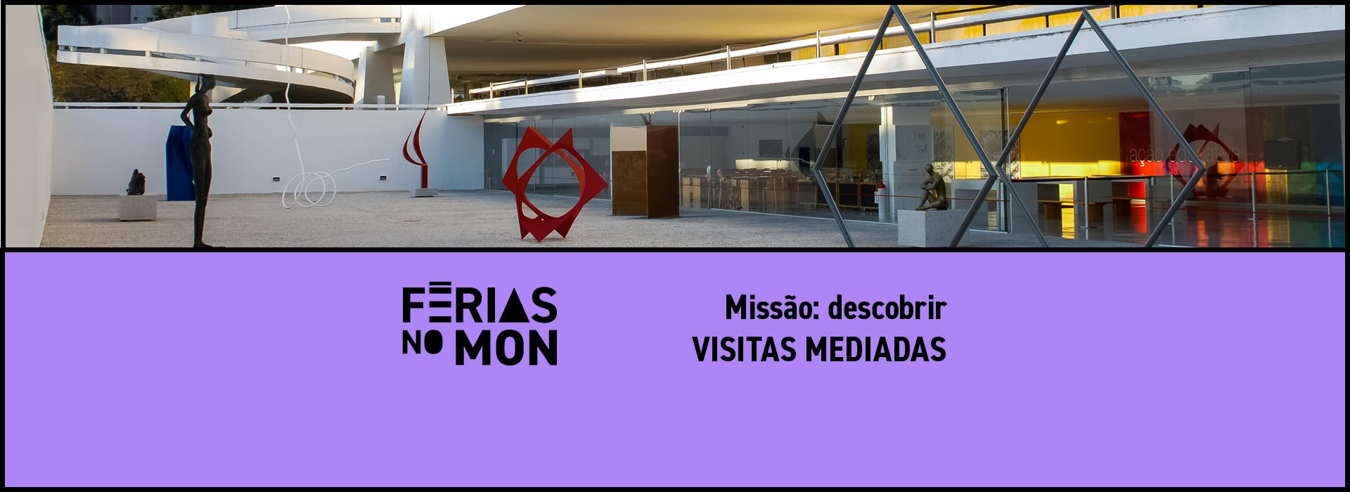 De 13 a 30 de janeiro, o MON se transforma em um espaço de novas experiências! O Férias no MON oferece três semanas de atividades; convidamos o público para a oportunidade de ter novas experiências individuais e coletivas com o espaço do Museu e com a arte. São mediações, oficinas e ateliês para todas as idades. Participe e crie memórias!