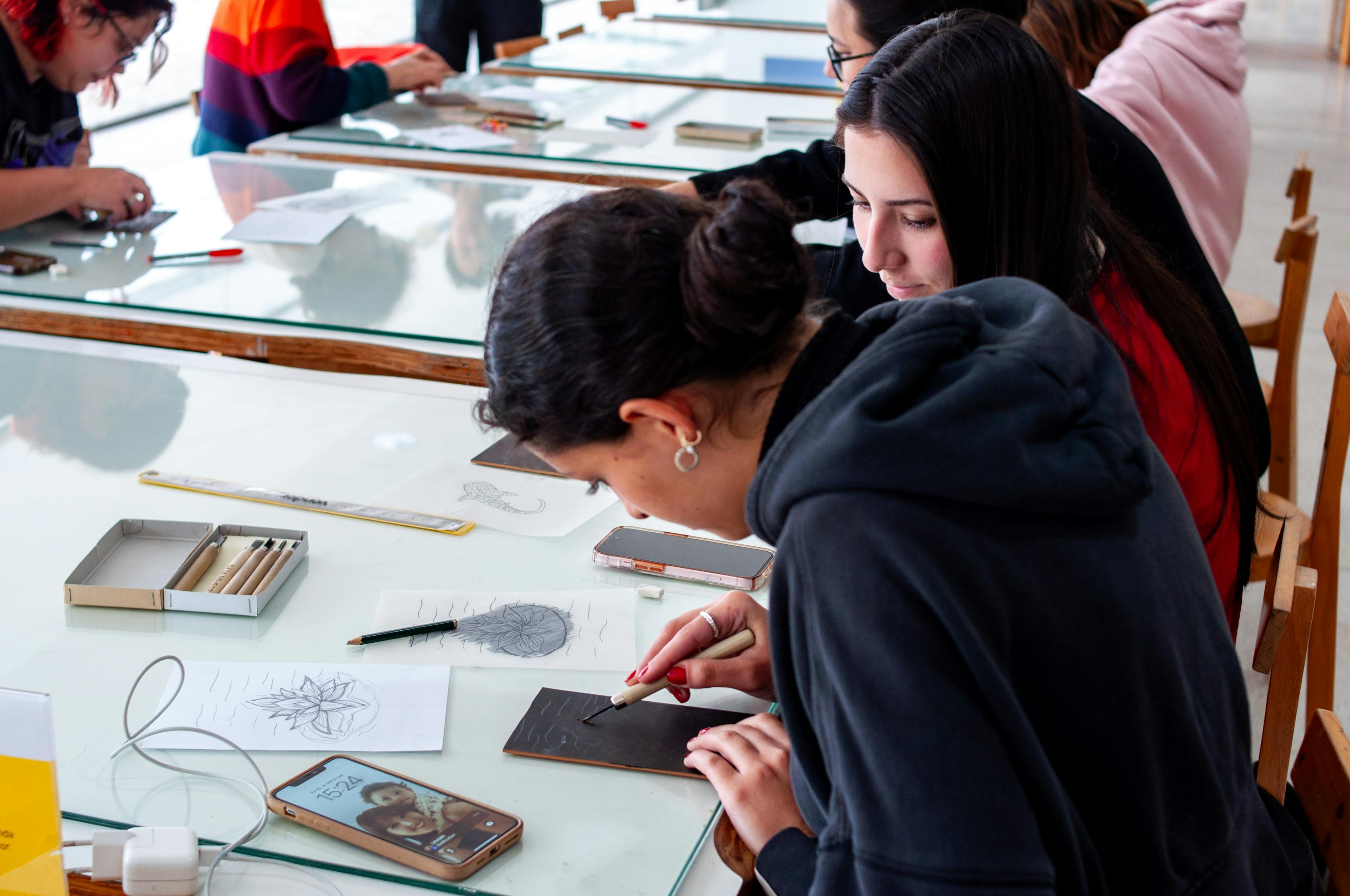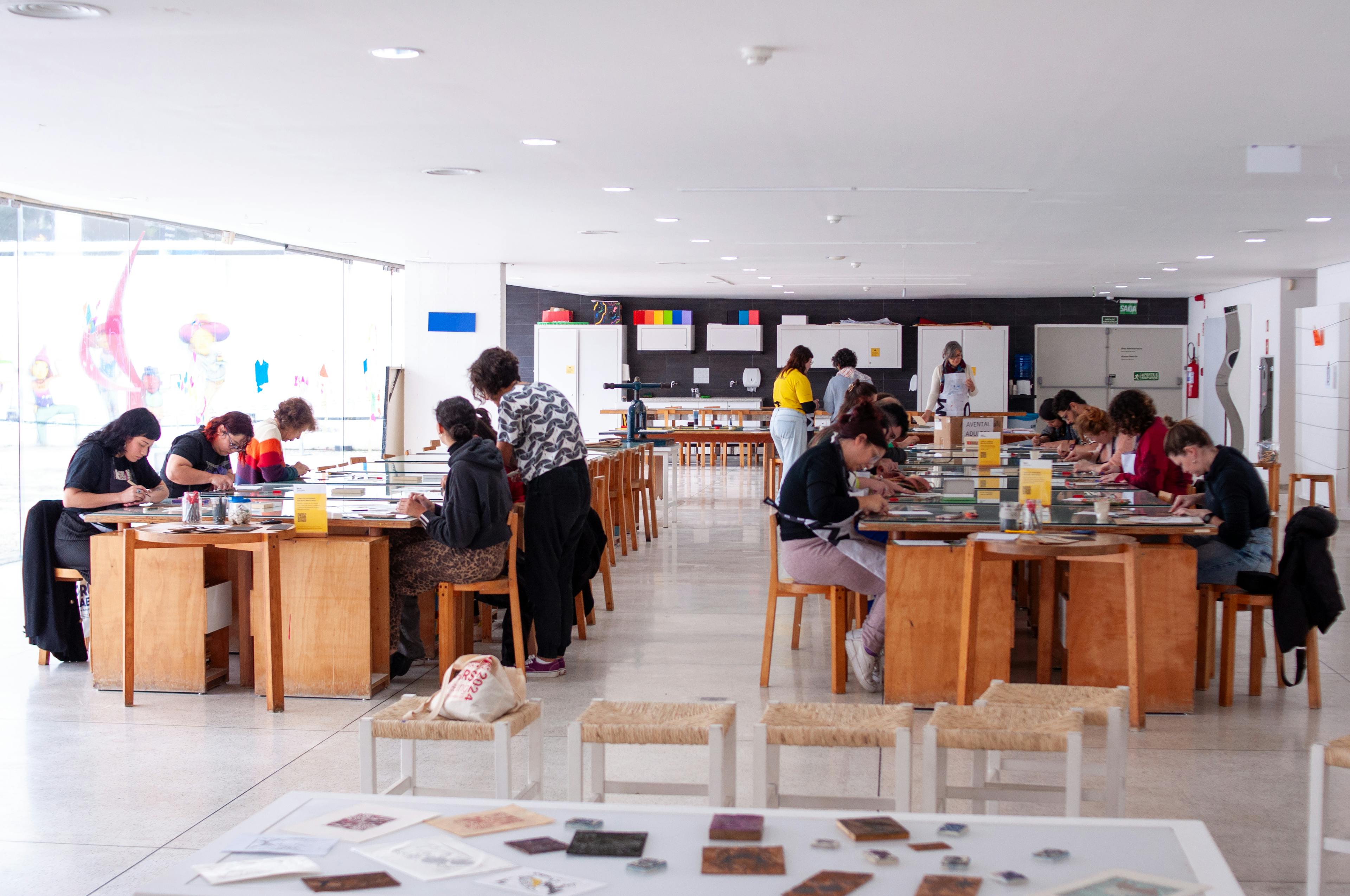 No Espaço de Oficinas, localizado no subsolo do MON, a oficina convida o público a explorar os limites entre a pintura e o desenho, utilizando materiais como tinta nanquim, giz pastel e aquarela para explorar as possibilidades criativas.