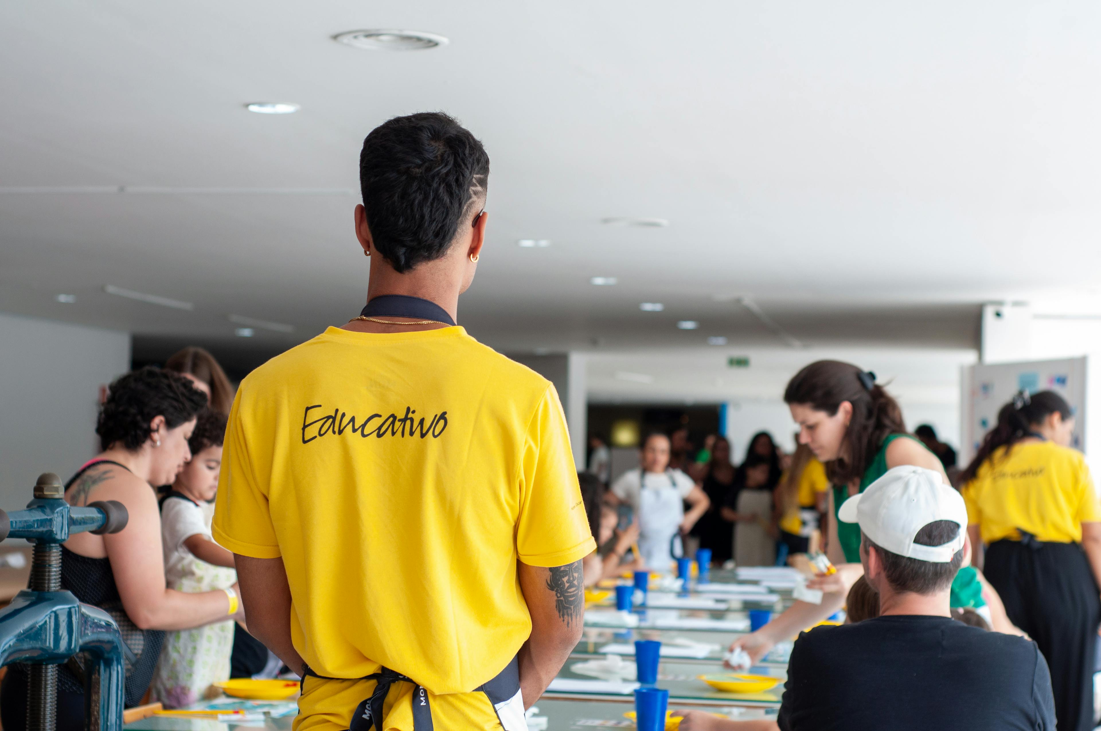 No ateliê de criação, o Espaço de Oficinas atende 60 pessoas simultaneamente e a rotatividade de participantes é realizada por ordem de chegada;
