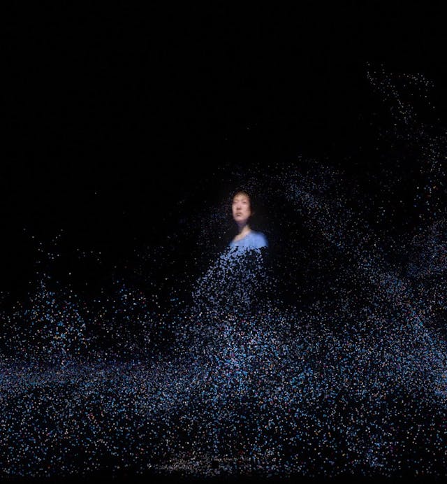 Quando os visitantes entram na zona de detecção da instalação, inicialmente veem sua própria imagem diante deles. No entanto, pouco depois, essa imagem começa a se dissolver e se transforma gradualmente em partículas. Esses nossos fragmentos permanecem no espaço virtual mesmo depois de partirmos, misturando-se com outros, transformando-se, criando novas formas e paisagens, e interagindo entre si.
