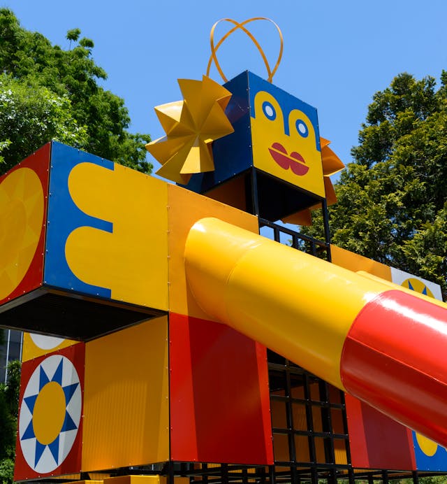Próximo ao Giroscópico, a obra “Afenufu vivalulu amulufu fufulufu” é uma escultura autoportante com escorregador, balanço e outros elementos para interação das crianças.